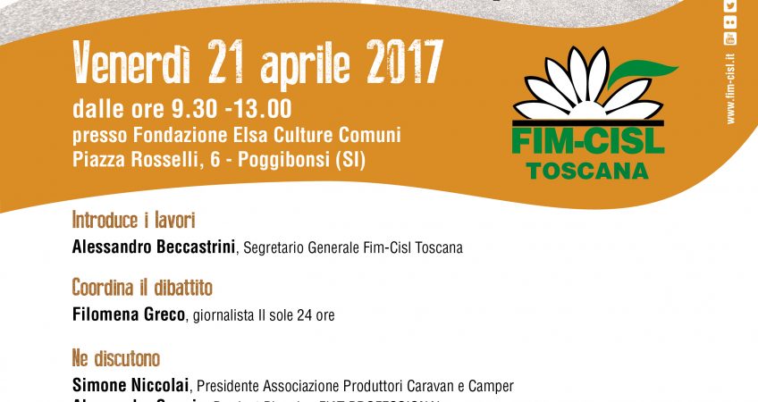 Si è svolto venerdì 21 aprile “Sì, viaggiare: sviluppo e occupazione nel distretto del camper”, il convegno organizzato da Fim-Cisl Toscana, tenutosi a Poggibonsi (Fondazione Elsa Culture Comuni – piazza Rosselli 6), capitale della ‘camper valley’ toscana. Quello a cavallo tra le province di Siena e Firenze è tra i maggiori distretti del camper in Europa (in Italia ci sono poi due stabilimenti decentrati ad Atessa in Abruzzo e Montone in Umbria) e conta 1500 occupati diretti e 4mila nella filiera. Un comparto che pare ormai uscito dalla crisi, trainato da un vero boom dell’export: dai 6.829 veicoli esportati nel 2013 si è passati a 12.912 (+89%) del 2016, su una produzione complessiva di 15.143 veicoli in Italia, per un fatturato attorno ai 750 milioni di euro. I lavori sono stati introdotti da Alessandro Beccastrini (Segretario Generale Fim-Cisl Toscana), con la partecipazione di Filomena Greco (giornalista del Sole 24 Ore), che ha moderato la tavola rotonda, e come relatori Simone Niccolai (Presidente Associazione Produttori Caravan e Camper), Alessandrto Sannia (Product Planning FIAT PROFESSIONAL), Simona Bonafè (Eurodeputato Partito Democratico), Ferdinando Uliano (Segretario nazionale FIM-CISL) e Fabio Petri (Presidente provinciale Cna Siena). Sono intervenuti anche rappresentanti di Confindustria, Federmeccanica, Unionmeccanica, Cna, Aziende Indotto, Fim, Cisl, Rsu, Sindaci e amministrazioni dei Comuni del distretto Camper: Firenze, Siena, Poggibonsi, San Gimignano, Colle Val D’Elsa, San Casciano.